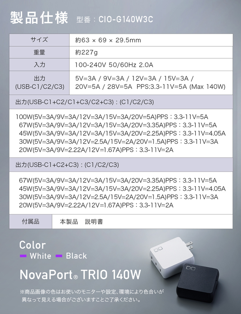 CIO、単ポート140W出力対応の充電器「NovaPort TRIO 140W」