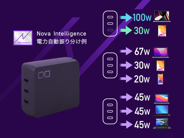 同社の独自機能「NovaIntelligence」を搭載し、デバイスごとに必要な電力を自動的に振り分けが可能。最大140Wを各ポートへフレキシブルに割り振るので、ハイスペックなノートPCやスマホ、ゲーム機など様々なデバイスを1台で最適速度で充電できるという。