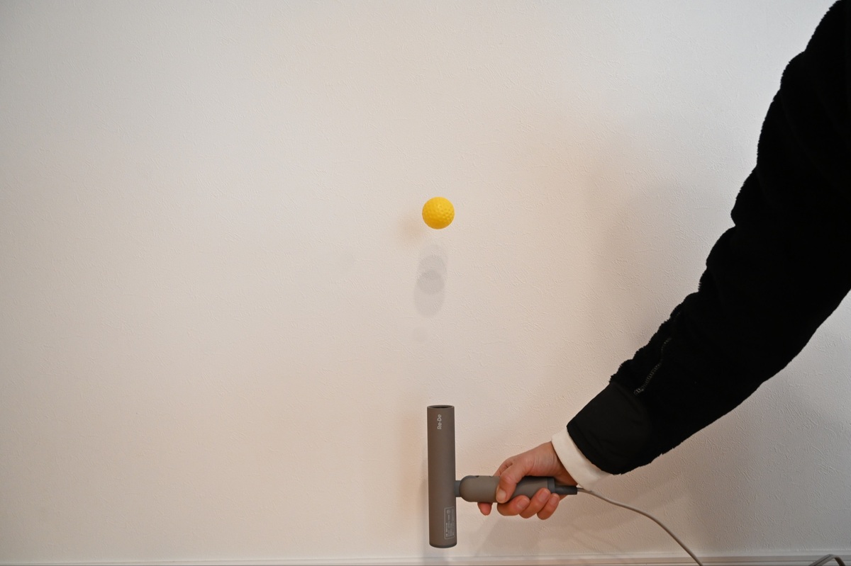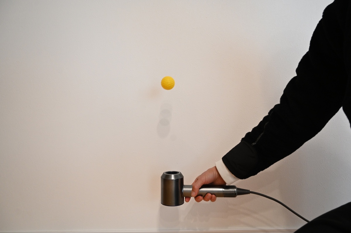 プラスチックのボールを風に乗せたところ、高さ約25cmまで浮かび上がりました。ダイソンの約30cmには及びませんが、かなり直進性の強い風が出ていることがわかります。