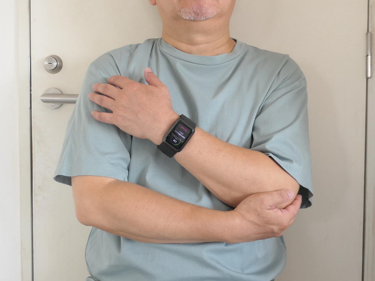 血圧計は起動して、「測定」をタップする(もしくはヘルスボタンを押す)だけで測定できます。タップしてから5秒後にカフが膨らんで、測定が開始されるので、その間に正しい姿勢をとる必要があります。椅子に座って、両足を床に着けて、ウォッチが心臓の高さにくるようにして、腕が動かないように、右手で肘から支えます。だいたい40秒ほどで計測が終わり、画面に血圧値が表示されます。