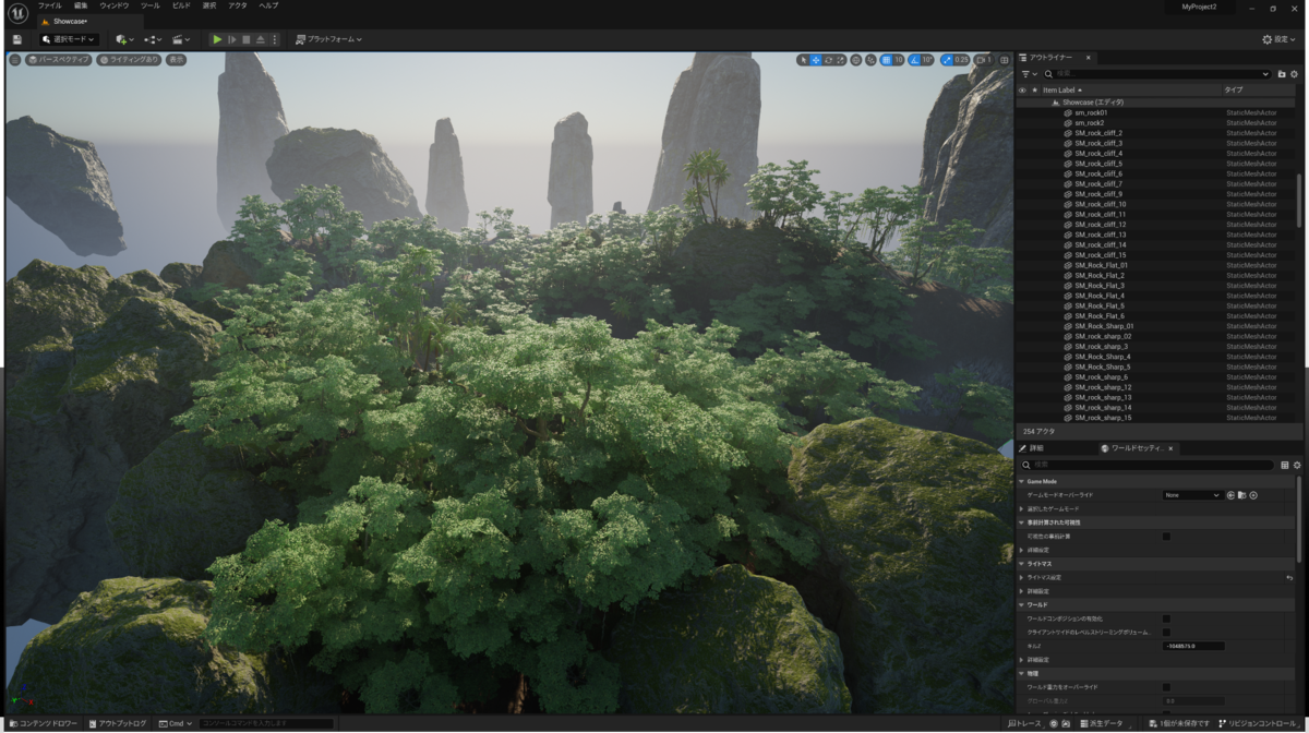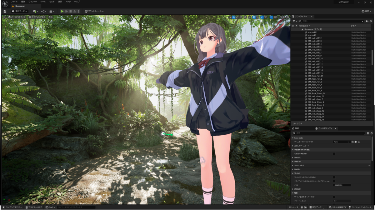 ビルド対象にしたデータは、UEマーケットプレイスで販売されているアセットの「Tropical Jungle Pack」のサンプルマップ。プレイヤーキャラクターと仮定してVRM4Uプラグインを使い、開発時のチェック用に使っているキャラクターデータ「QuQuオリジナルアバター “U”」を読み込んでいます。マップに登場するオブジェクトは60種、合計308個。335万ポリゴン、約200メートル四方のジャングル空間です。感覚的には一般的なロールプレイングゲームの1ステージ分程度のサイズです。