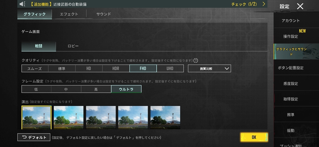 「PUBG MOBILE」のグラフィック設定はクオリティーが「FHD」、フレーム設定が「ウルトラ」までと現行のAndroidスマートフォンでは最高水準に上げることが可能だ