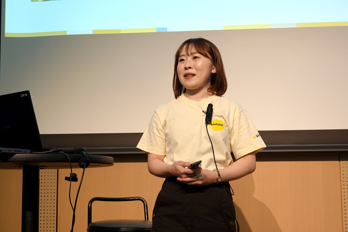 まずは、サイボウズ 営業本部 リージョナル第3営業部 九州営業グループ 山崎佑美氏が登壇し、kintoneアプリの開発手法についてプレゼンしてくれた。