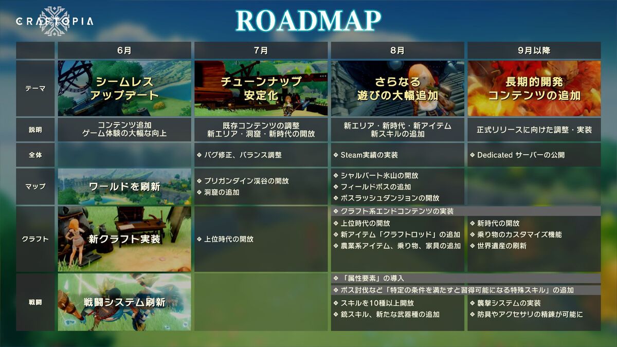 アップデートにあわせて、2023年7月以降のロードマップを公開。バランス調整から新規大型コンテンツの追加を含めて、クラフトピアはこれからも継続的にアップデートを実施予定とのこと。