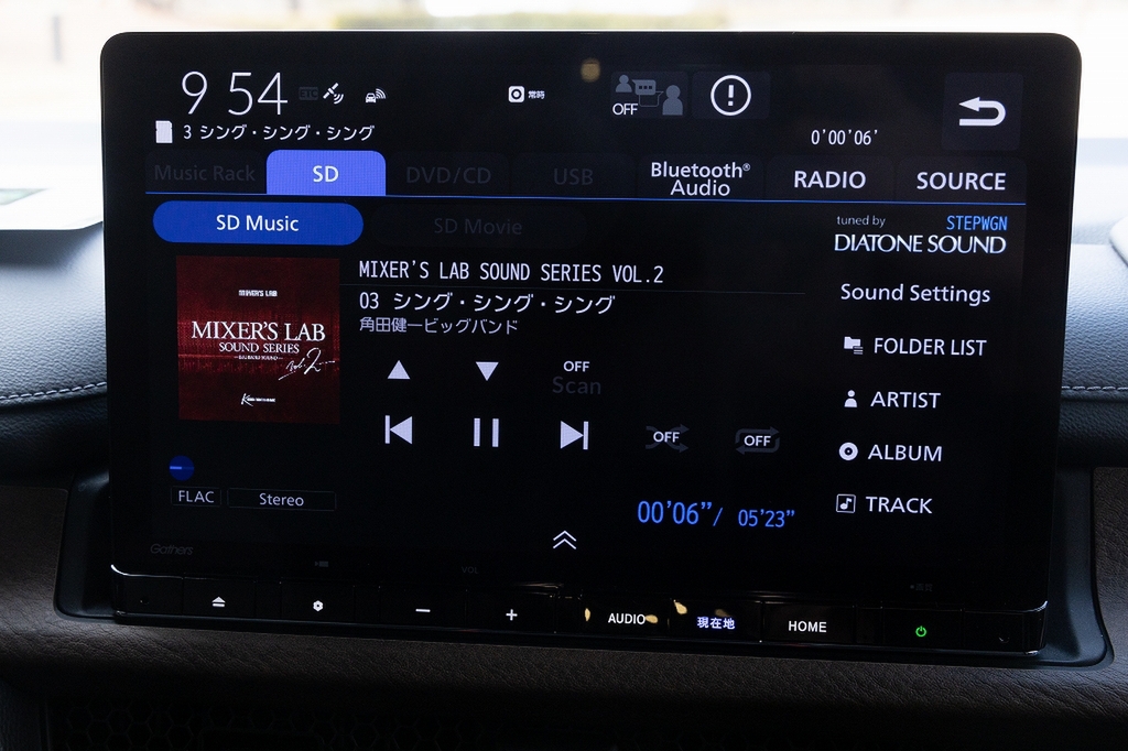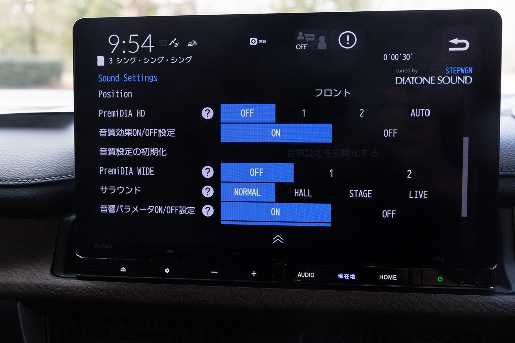 では、現代はどういったモデルがあるのでしょう。まずはカーオーディオの深化を体験することに。現在のギャザズは、車両によって音響特性を合わせてセッティングをしているのだそう。さらにオプションのハイグレードスピーカーシステムと組み合わせると、「DIATONE SOUND」または「音の匠」のいずれかのモード(車種によって異なる)が利用できます。とだけではわかりにくいので、ご紹介しましょう。