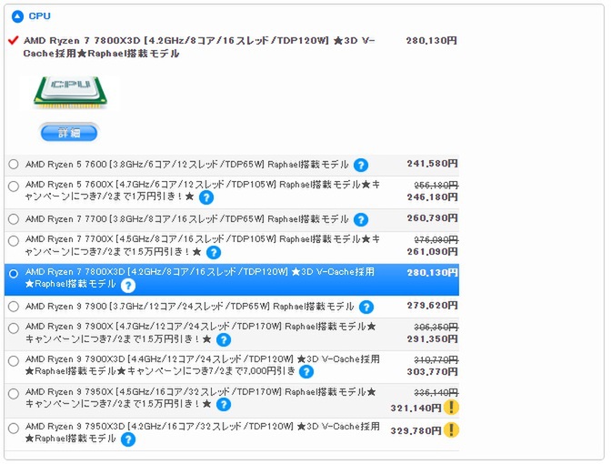 まずはCPUをコスパの高さで定評がある「Ryzen 7 7800X3D」に変更します。8コア/16スレッドなので、さすがにゲーム配信や動画編集などには不向きですが、ゲームタイトルによっては第13世代インテルCoreプロセッサーのハイエンドモデル、「Core i9-13900K」を超えることもあります。