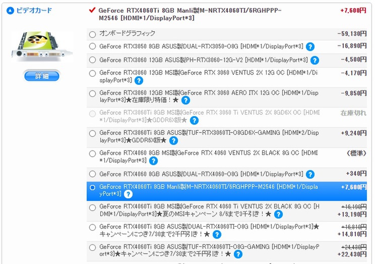 次に、ビデオカードをGeForce RTX 4060搭載モデルから同RTX 4060 Ti採用モデルに変更しました。「Ti」の有無でだいぶ性能が変わる割に、なんと+7600円で選べるのでかなりおいしいです。というか、Manli恐るべしですな……。