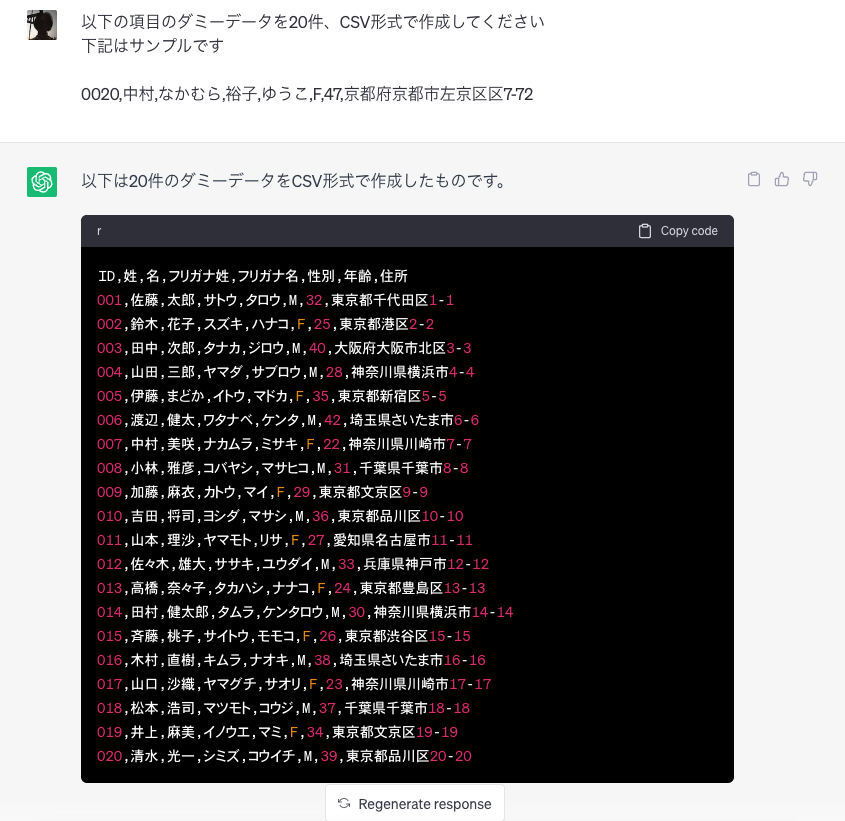 負荷テストなどの目的でCSVのダミーデータが必要になるときがあるが、これもChatGPTの得意技だ。