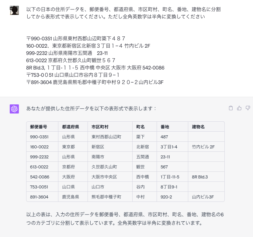 無料版のGPT-3.5の場合、全角半角が統一されていなかったり、住所の区切りを間違てしまったりといったこともあるが、その場合は「◯◯は町名ではなく番地です」のように訂正してやれば、同セッション内に限られるが、次から同じまちがいはしなくなる。
