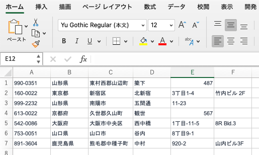 バラバラな形式が入り混じった住所のデータを郵便番号、都道府県、市区町村、町名、番地、建物名にきちんと分割して表形式で表示してもらった。