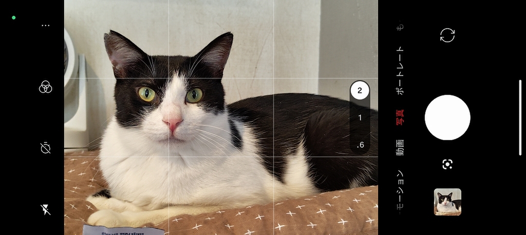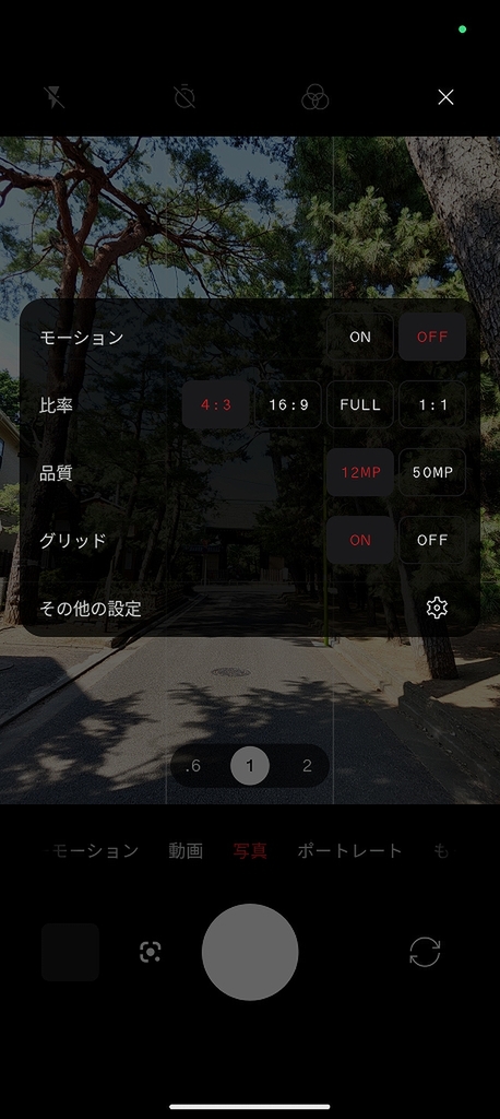 カメラアプリは12MPモード時は0.6x(ウルトラワイド)、1x、2x(メインカメラのデジタルズーム)の3つの倍率が並ぶ。