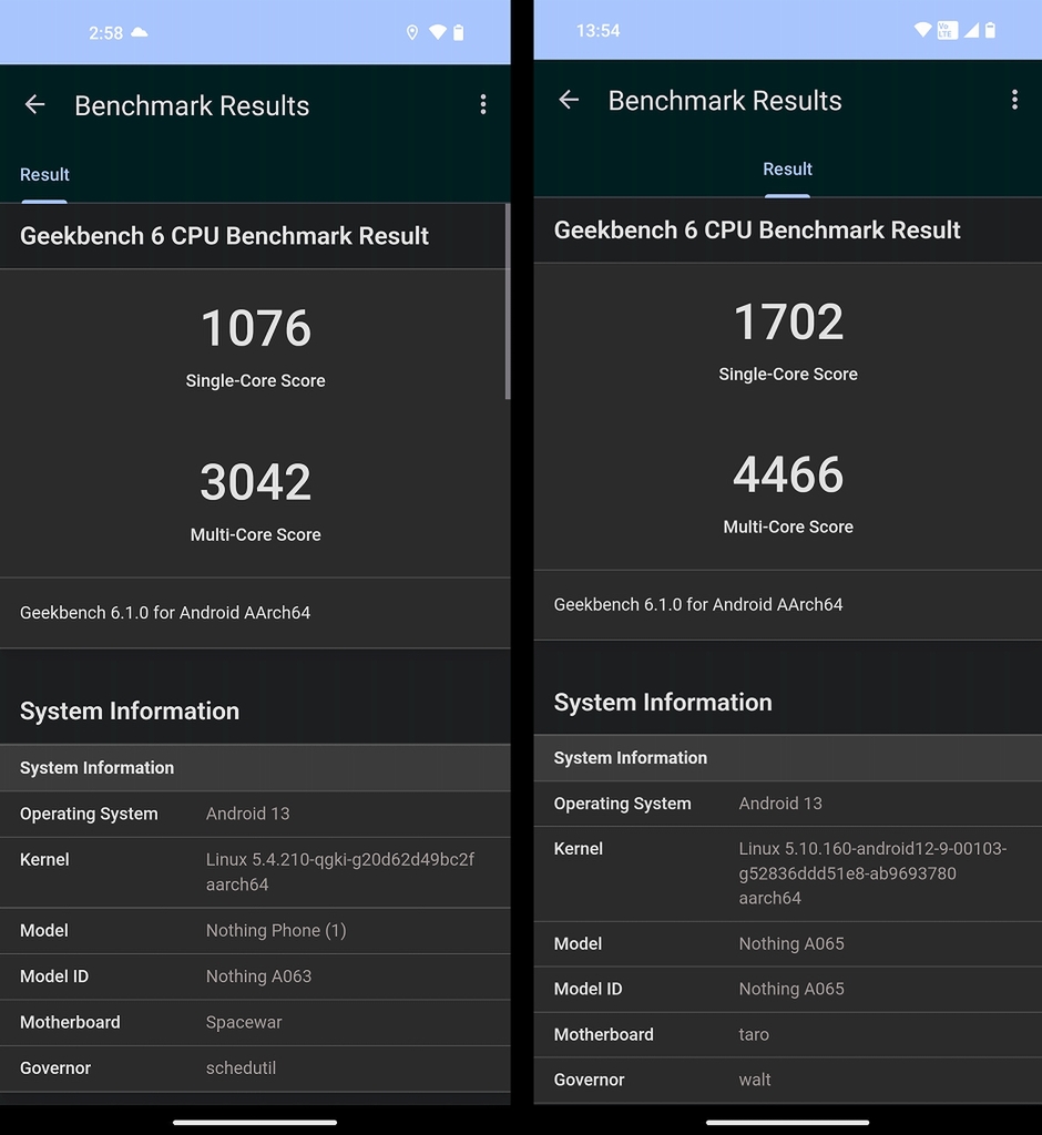 「Geekbench 6」とアプリでベンチマークを計測した結果。左がPhone (1)の8GB+256GBモデル、右がPhone (2)の12GB+256GBモデル。パフォーマンスは大幅に向上している