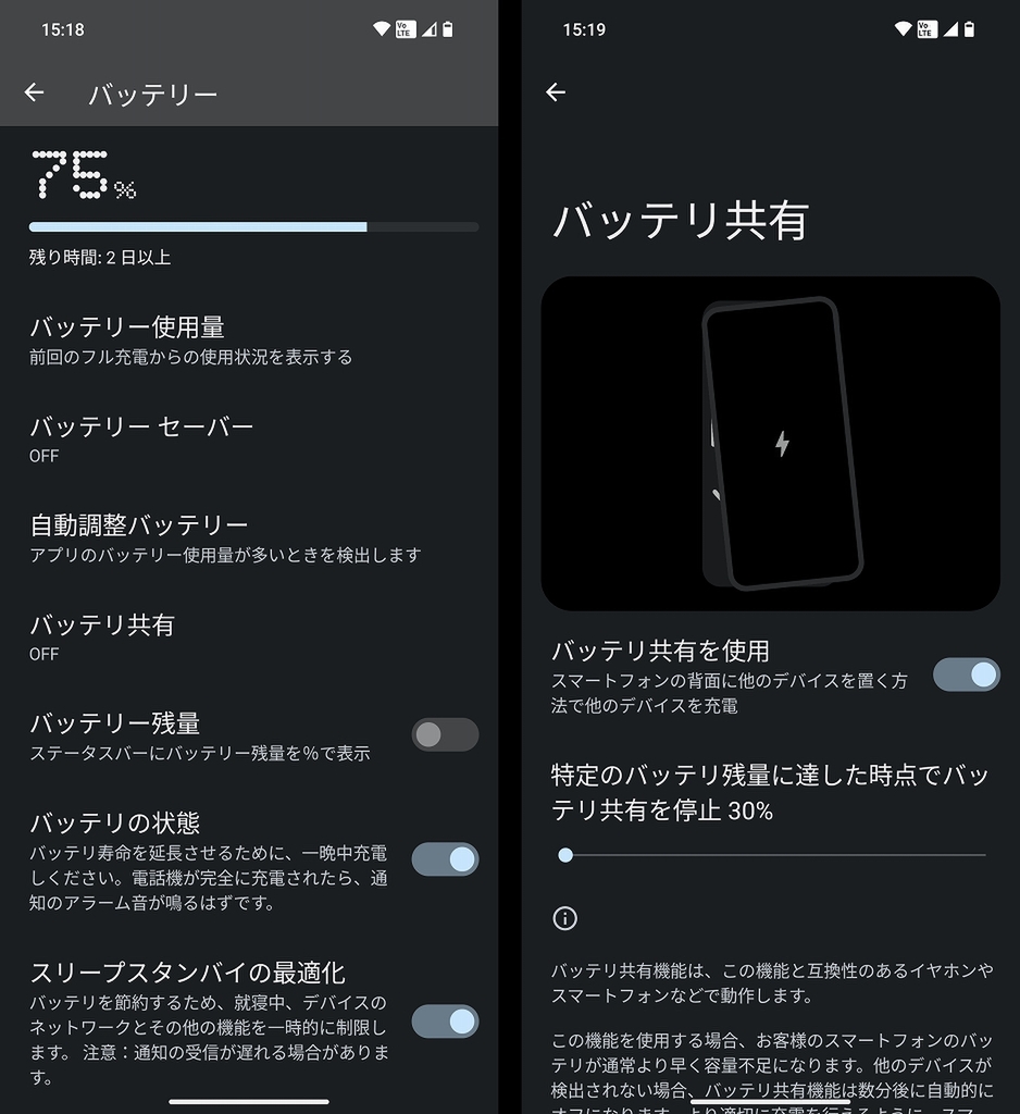 バッテリー容量は、Phone (1)から200mAh増えて4700mAhに。1日は余裕で持ち、使い方によっては2~3日くらい使い続けられそうです。Phone (1)では33Wだった急速充電が45Wになり、約55分でフル充電できるように進化。前モデルと同じくワイヤレス充電も可能で、Qi対応デバイスに給電する「バッテリ共有」機能も備えています。