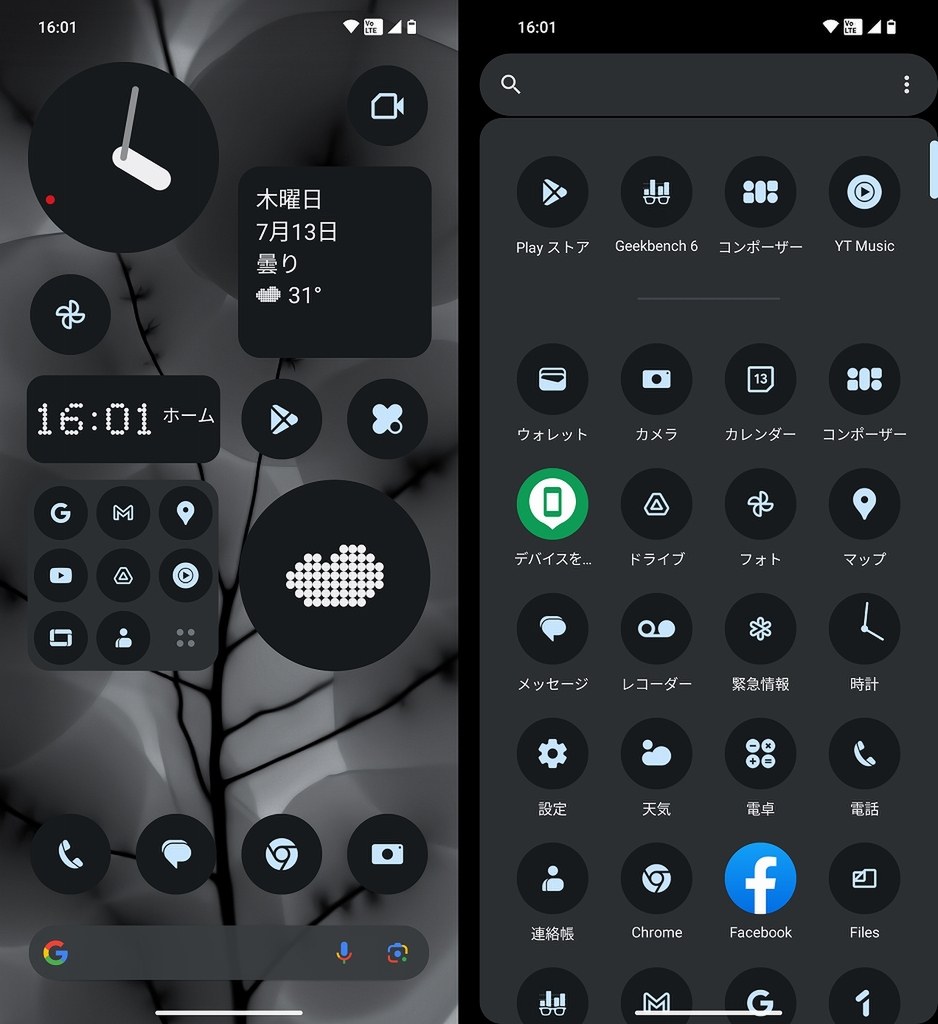 Phone (1)の画面デザインは、Androidらしさを維持しつつ、随所にNothingらしいスタイリッシュなデザインが盛り込まれている印象だったのですが、Phone (2)では、ホーム画面のアイコンがモノクロ表示にできるようになり、ウィジェットのバリエーションも増加。画面のカスタマイズ性がぐ~んと向上しています。個人的には、現行のスマホの中で、最もクールで、なおかつ使いやすいホーム画面を編集できるように感じています。