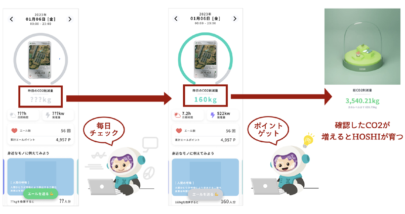 ・エールを送ることで積み上げたCO2削減量に応じてHOSHIが育つこと
