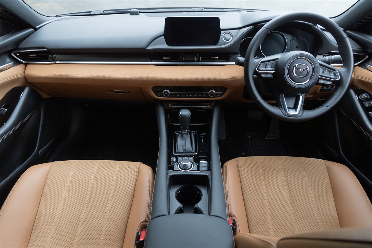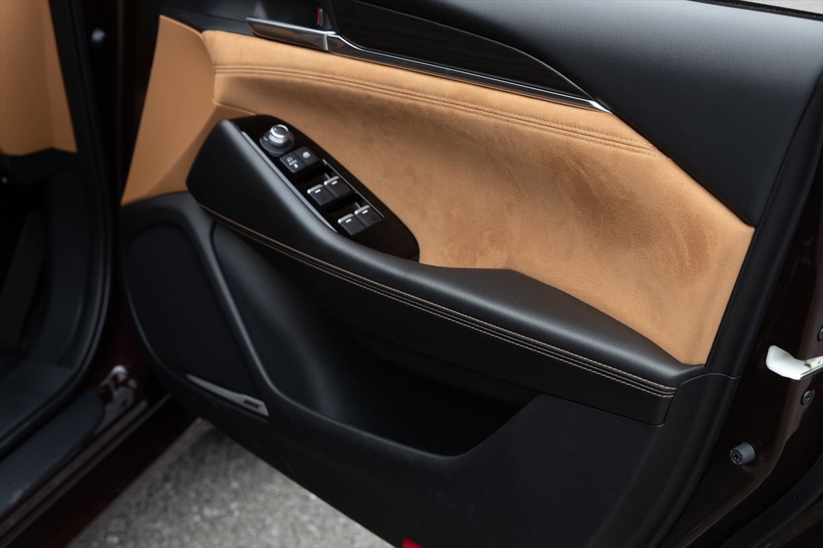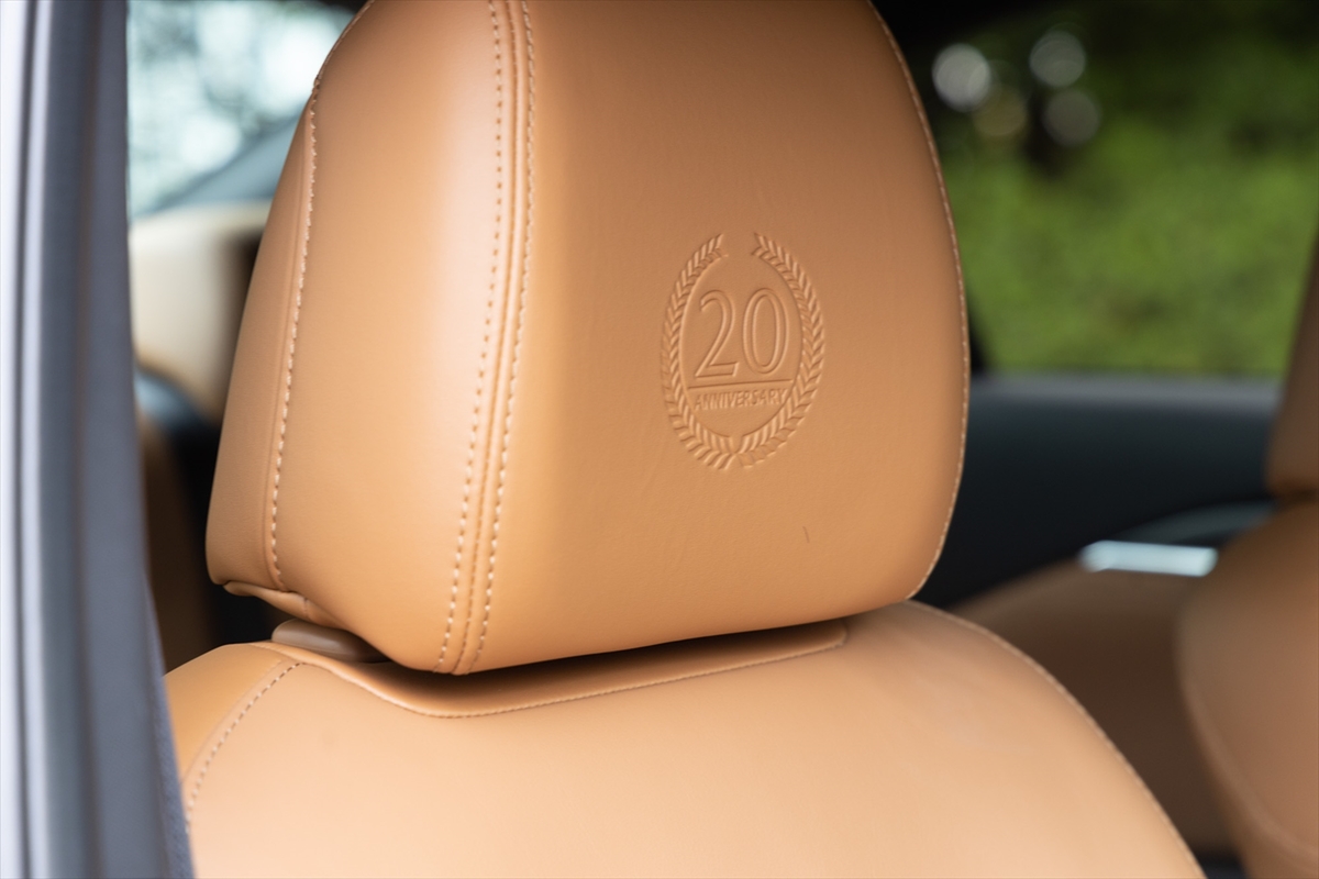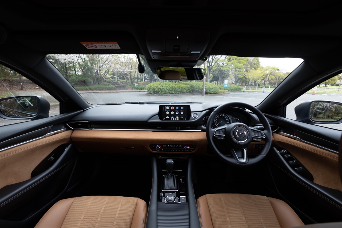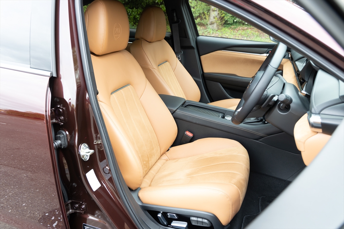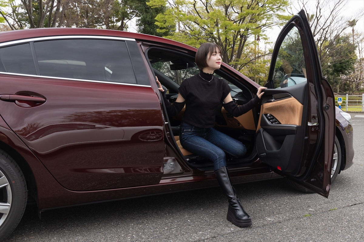 タンレザーのシートに目を奪われる室内。ヘッドレスト、フロアーカーペットに20周年の記念ロゴが見えます。「ここにも20周年……」と、若い唯さんはポツリ。さて、久しぶりのアテンザかなと思いきや「結構インテリアが違うんですね」とのこと。逆に言えば、今風にアップデートされている、ということなのでしょう。インテリアの雰囲気には満足気で、「この前のCX-60もですが、イイモノ感がありますね」と笑顔。乗降性は文句ナシです。