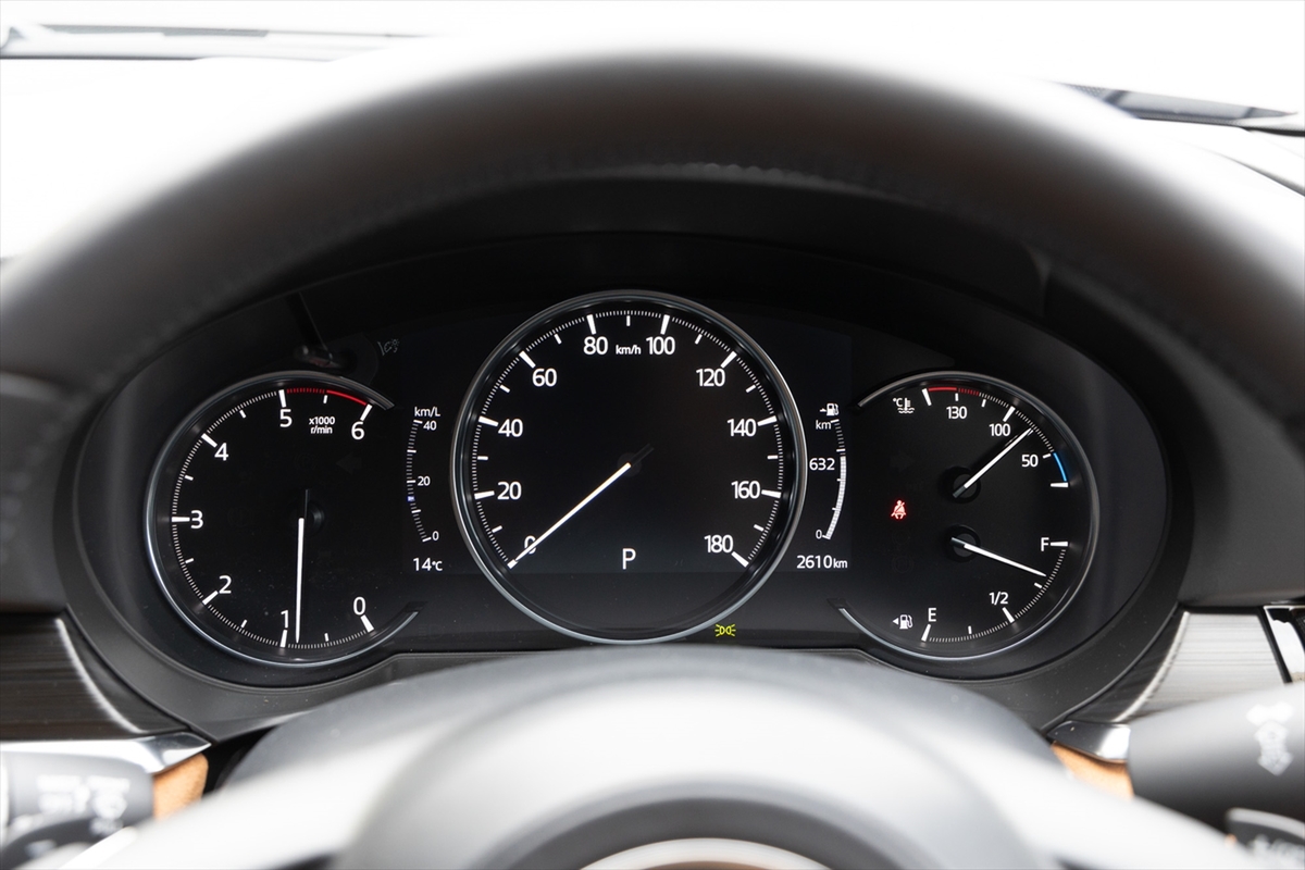 メーターはLCD全盛の世には珍しい指針式。逆にこちらの方が見やすかったりします。中央の速度計のみLCD画面で、様々なインフォメーションが表示できます。「このメーターパネルの感じがマツダですよね」と、見慣れた画面に安心です。ヘッドアップディスプレイも搭載していますが「これはあってもなくてもどっちでもいいですね」とのこと。