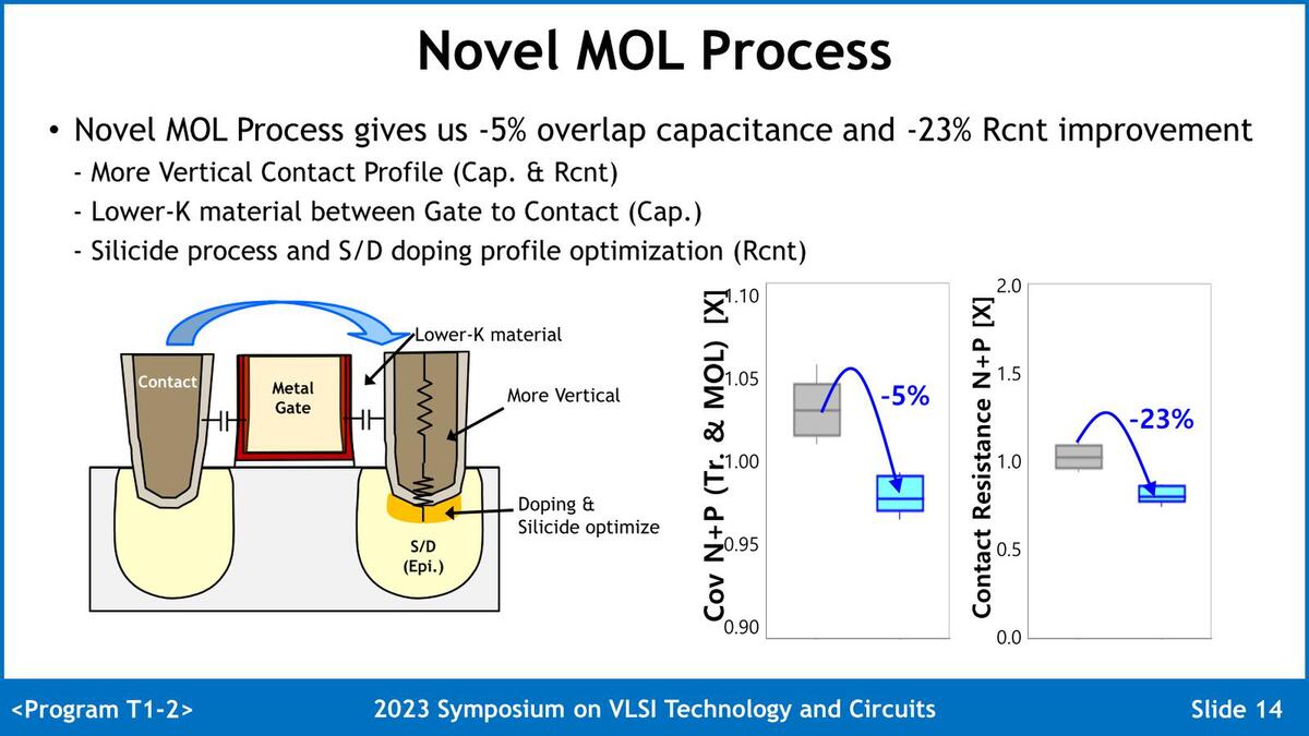 2つ目の問題については、直接的な回答ではないのだが示されたのはMOL(Middle Of Line:中間層)の製造プロセスの改良である。Metal Gateと接続するコンタクト部を、より細長い形状にするとともに、ソース/ドレインの接続部分の組成の最適化をすることで、寄生容量を5%、抵抗を23%削減したとする。