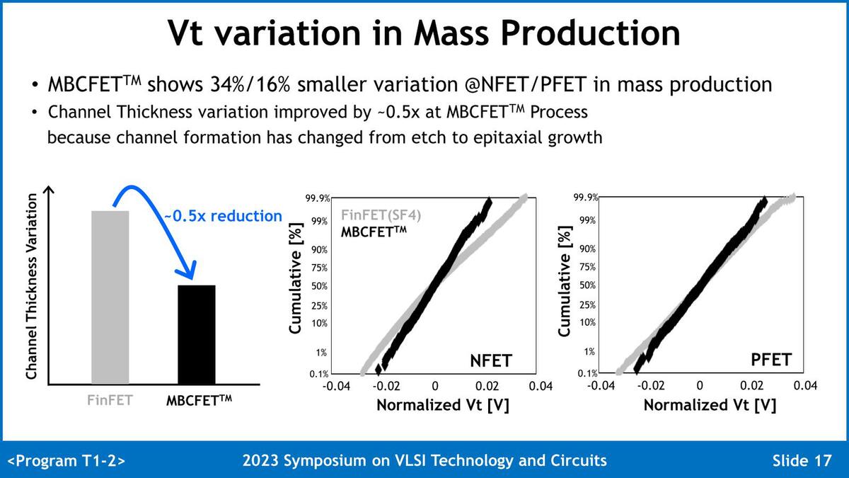 ちなみにこうした工夫の結果として、SF4と比較した場合、SF3では特性のバラつきが大きく減ったとされる。これを実現できた理由の1つはチャネルをCMPではなくエピタキシャル成長に切り替えたことがある。ただ確かに特性はそろいそうだが、CMPに比べると時間が掛かりそうな気がするのだが、そのあたりについては言及がなかった。