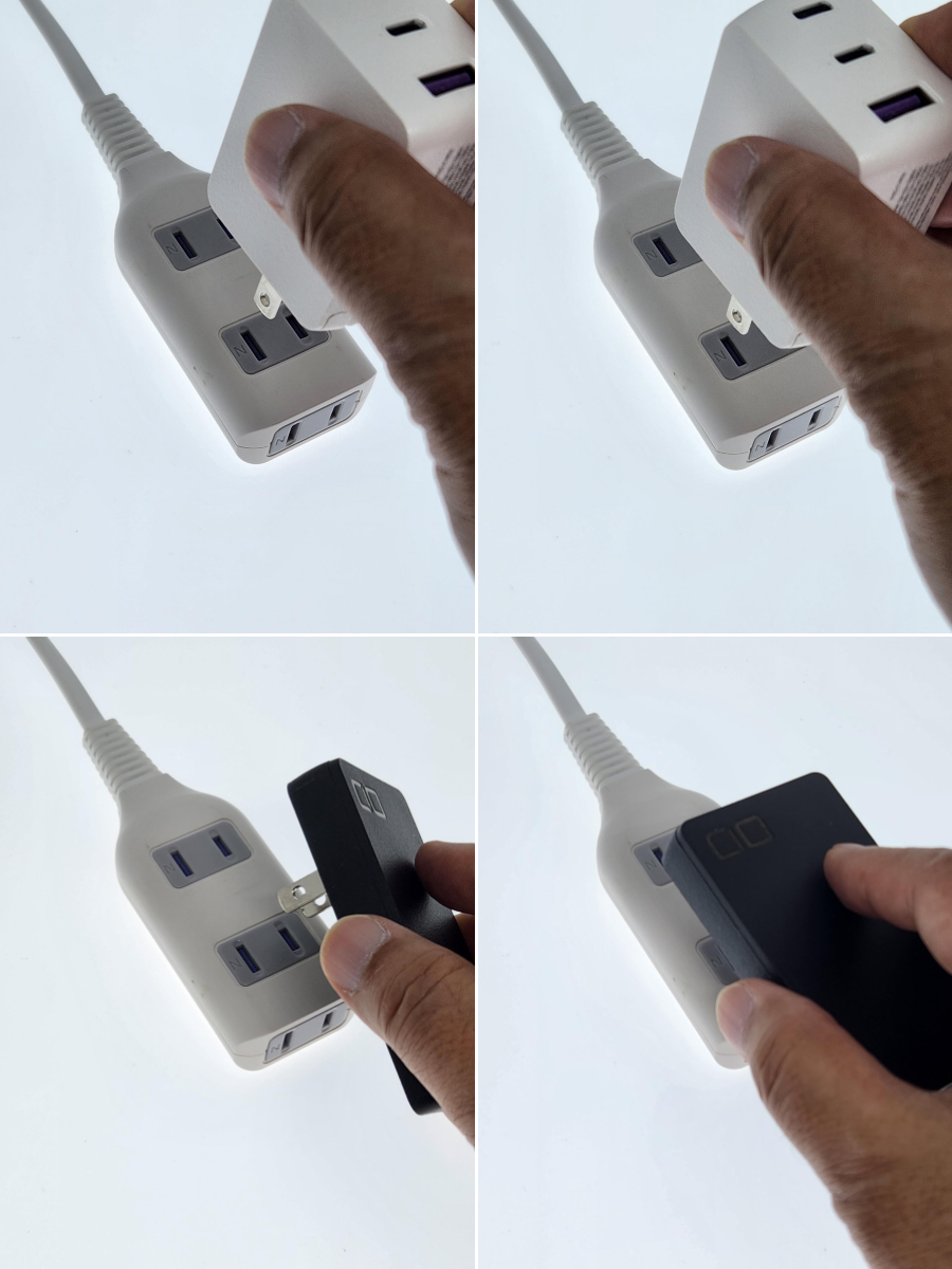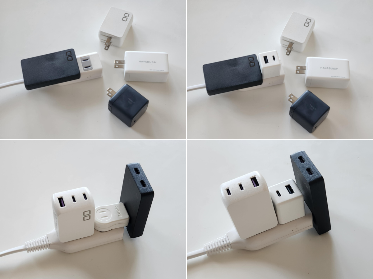 またコンセント穴が一定距離で均等に配置されているテーブルタップでも、スリム型のUSB ACアダプターはプラグの生えている面の面積が大きく横に広い形状のために、より多くのスペースが必要だ。100均ショップなどの3個口のテーブルタップに多くのUSB ACアダプターを効率良く挿して使うには、順列組み合わせの工夫が必要かもしれない。