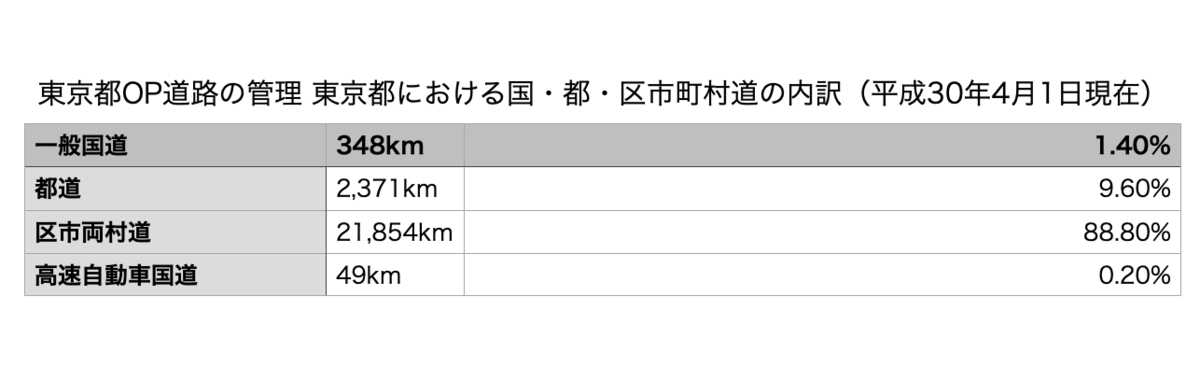 ── そうですね。じゃあまずは「東京都OP道路の管理 東京都における国・都・区市町村道の内訳(平成30年4月1日現在)」を見てみましょうか。
