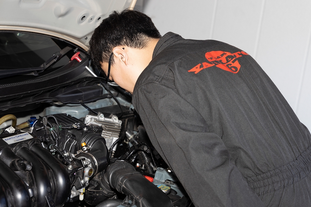 大学の自動車部の雰囲気。時に真剣、時に笑顔