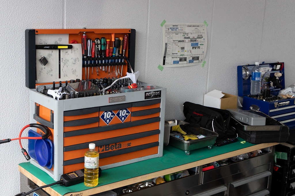 ピットを見回すと、とてもキレイ。汚れたらすぐ掃除をされているほか、工具箱は常に整理整頓されていました。工具箱と工具のメーカーが一致しないばかりか、違う工具メーカーのステッカーを貼っているところに、ほっこりしつつ、でも先輩方が買った工具を大事に使われているのかなとも。なぜか好感を持ちました。