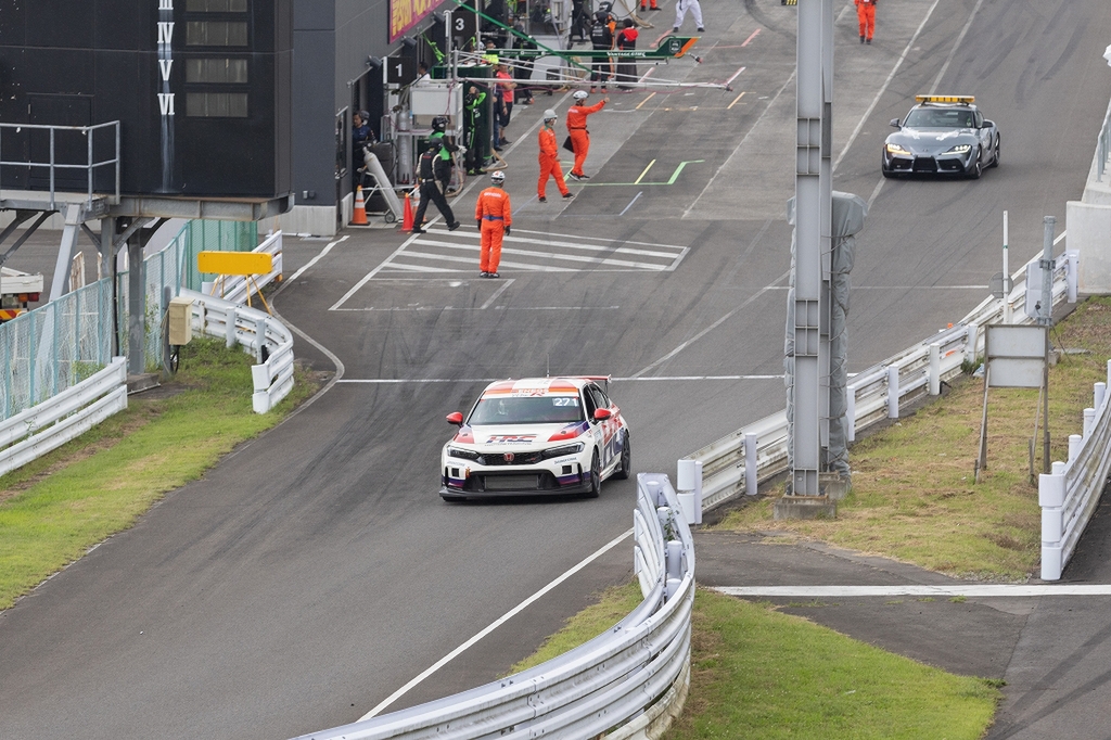 午後のレースはセーフティーカーが出る荒れ模様。そしてHRDCにもマモノが襲いかかります。なんとAドライバーの石垣選手の走行規定時間(60分)を前にしてガス欠症状が出てしまったのです。これは燃料計算を間違えた、というより想定より燃費が悪かったから。そのため給油だけのためにピットイン。そのままコースへ戻ります。チームは作戦を変更し、石垣選手でギリギリまで走りマージンを作る作戦に。