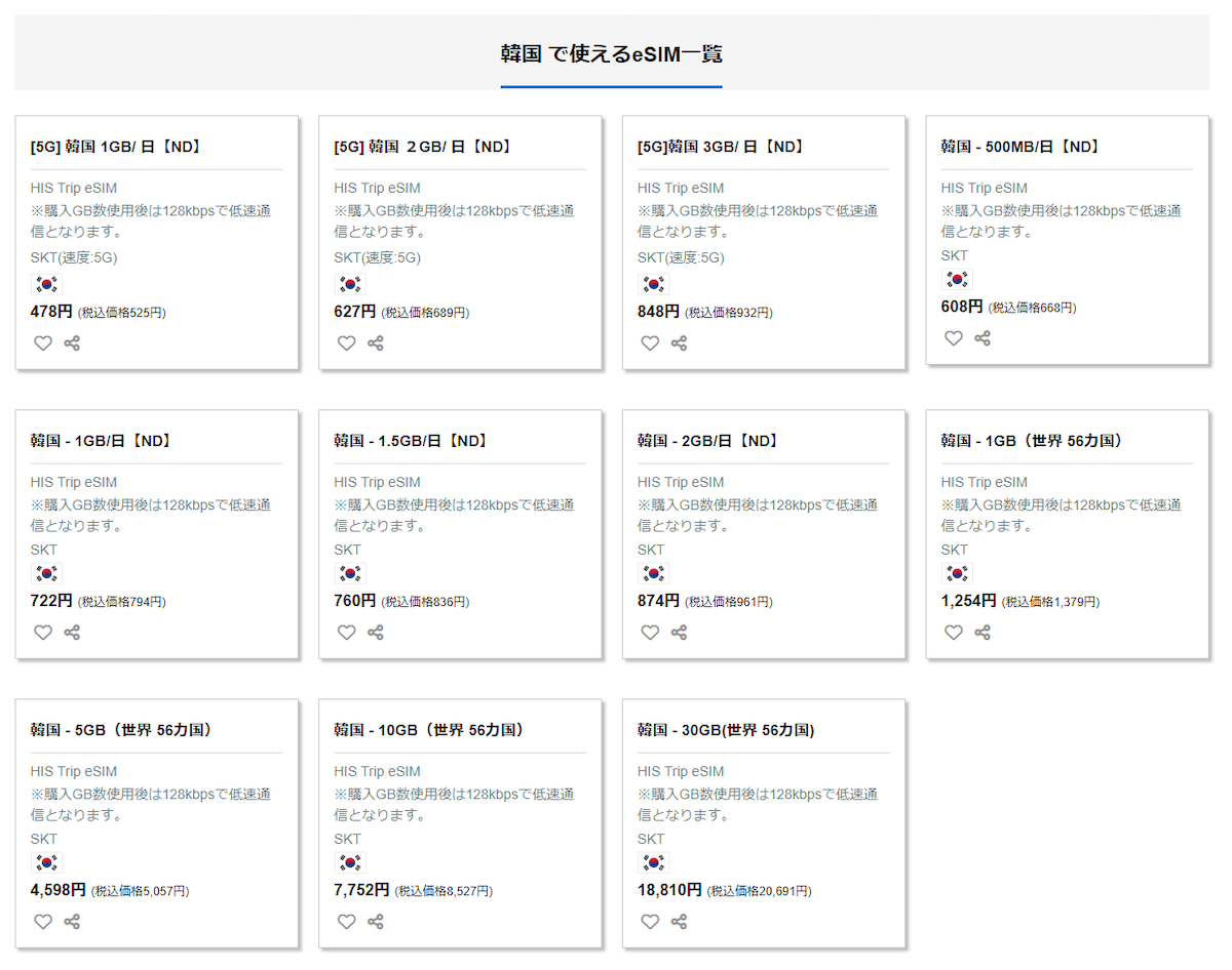 たとえばHISモバイルのTrip SIMで、韓国で使用できるプランの最安を見ると、1日あたり1GBで480円。使用できるデータ通信量に上限はあるものの、MNOの料金よりもずっとお得になっています。