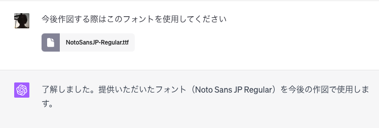 アップロードが終わったら「今後作図する際はこのフォントを使用してください」というプロンプトを添えて送信。これで日本語を含む図表を作成できるようになった。