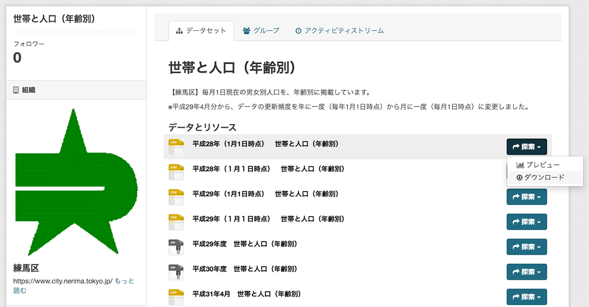 練馬区の平成28年世帯と人口(年齢別)データをダウンロードさせてもらった。