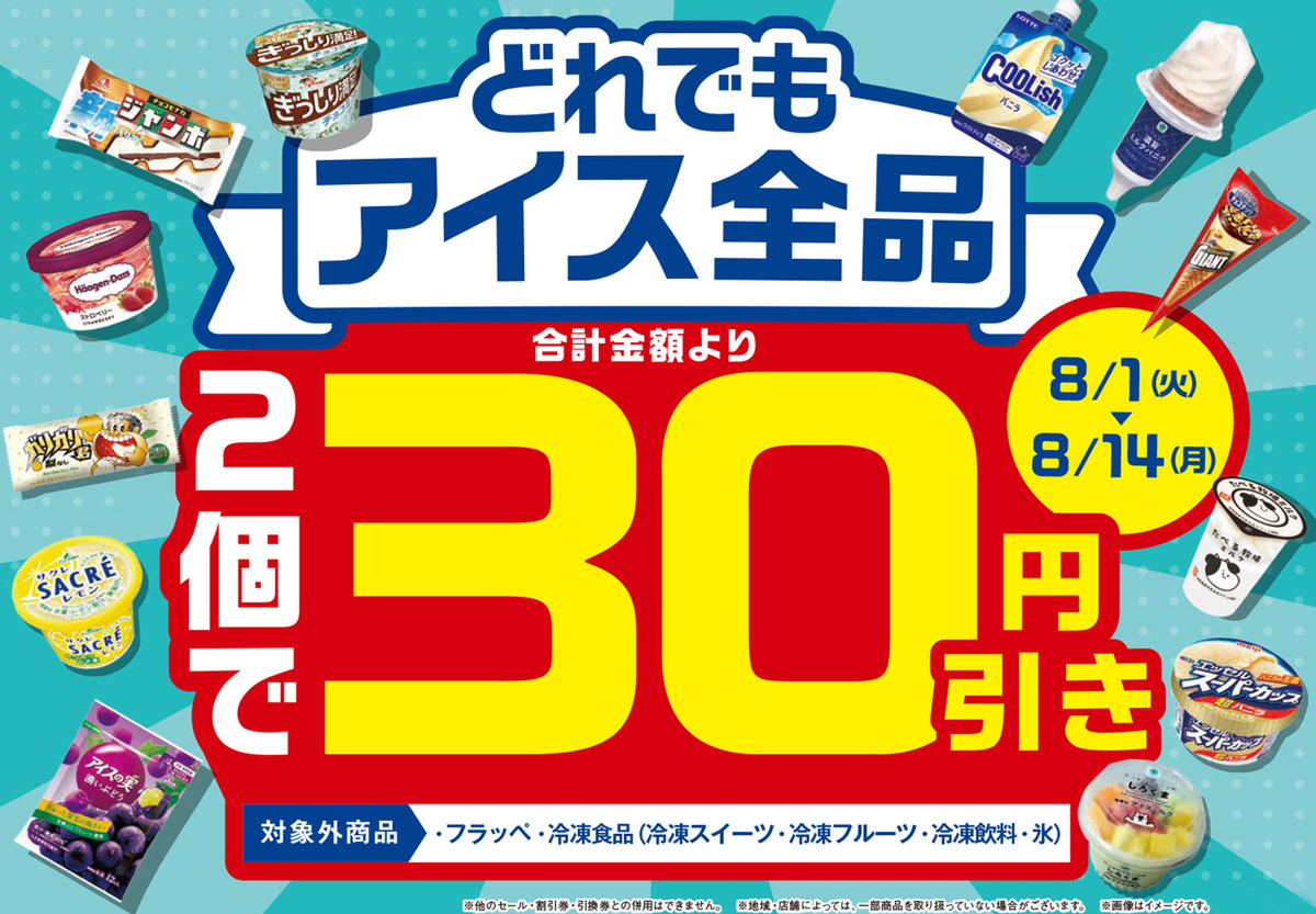ファミリーマートは、アイスがどれでも2個で30円引きとなるキャンペーンを8月14日まで、沖縄県を除く全国の店舗で実施しています。