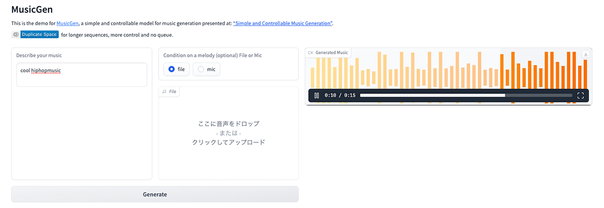 MusicGenはHugging Faceにてデモが公開されている。試しに「Cool Hiphop Music」というプロンプトで試してみるとたしかにそれっぽい音楽が生成された。