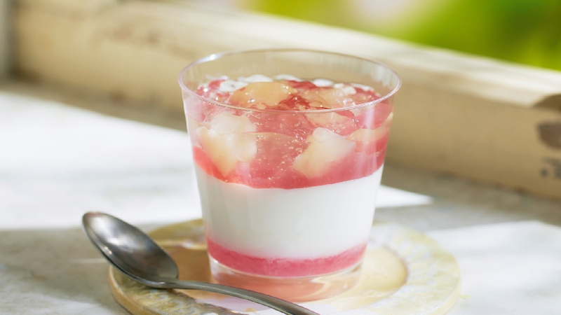 爽やかなピーチゼリーと、やさしい甘さの杏仁ゼリーを組み合わせたカップスイーツ。フルーツの果肉も楽しめるというカップスイーツです。