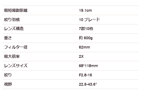 実物大の最大2倍倍率と、最短撮影焦点距離19.1cmを実現し、近接した被写体の撮影に適している。また、マニュアルフォーカスを採用し、フォーカス距離と被写界深度の目盛りが付いているため、正確なピント合わせを可能とする。光学系は7群10枚で構成されており、そのうち3枚の高屈折率レンズにより、球面収差の抑制と歪曲収差の低減が図られ、高いシャープネスと正確な描写をうたう。