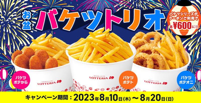 ロッテリアは8月10日~8月20日の期間限定でクーポン企画「お盆バケツトリオ」キャンペーンを実施する。