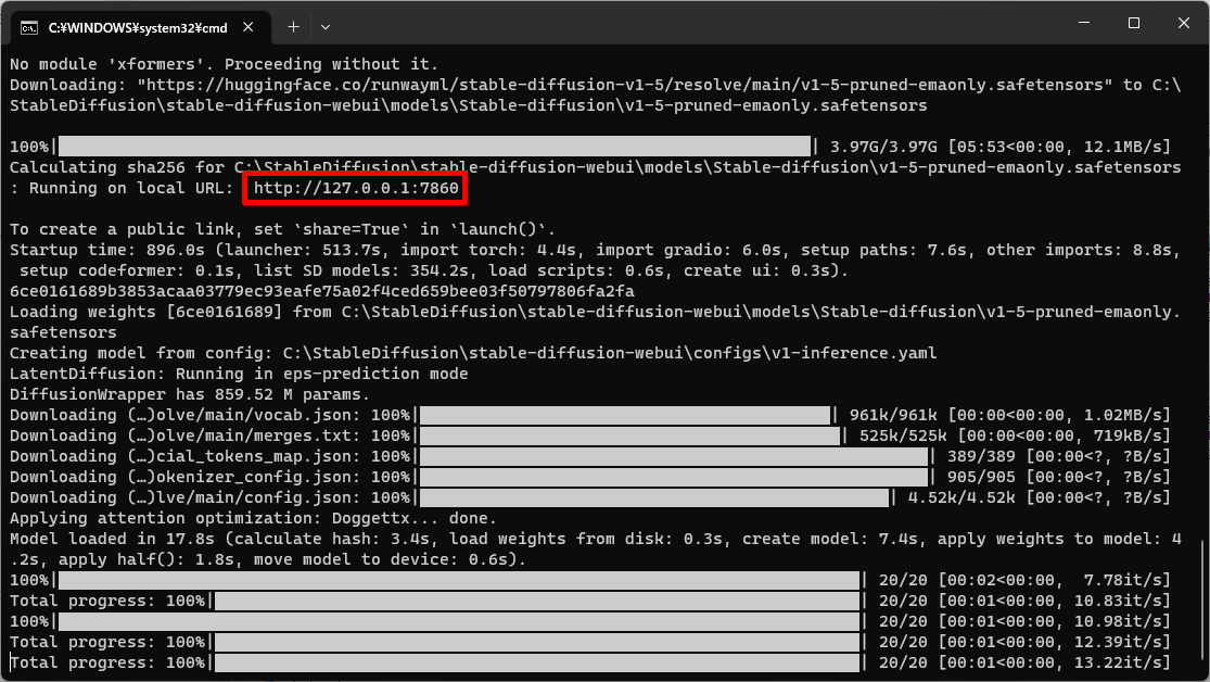 コマンドを実行すると、WebUIを起動するのに必要なファイルやフォルダが自動的にダウンロードされる。