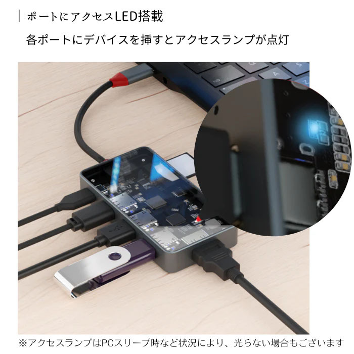 本体天板部が透明素材になっている「内部基盤が見えるシースルー構造」を採用するほか各ポートにアクセス時に点灯するLEDを搭載し、見た目の楽しさも味わえる。