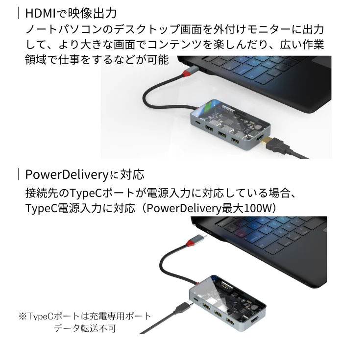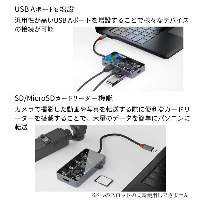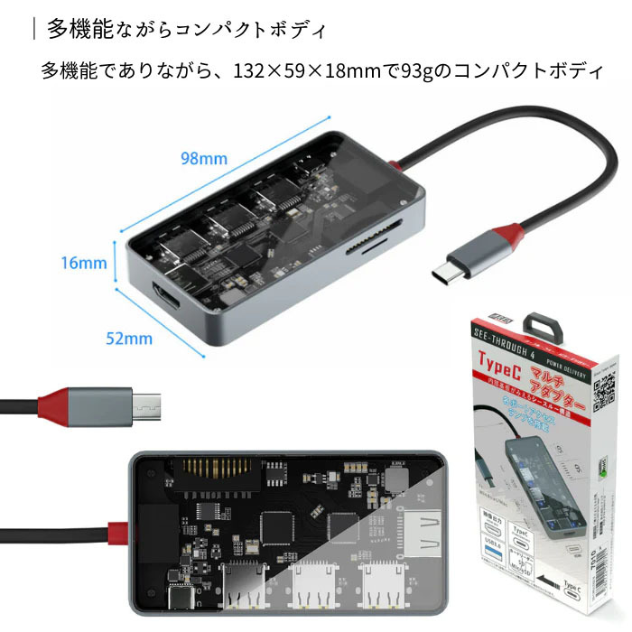 HDMI出力やメモリーカードスロットも備えるシースルーボディーのマルチアダプター「SEE-THROUGH4/SD-CMULTI02-B」