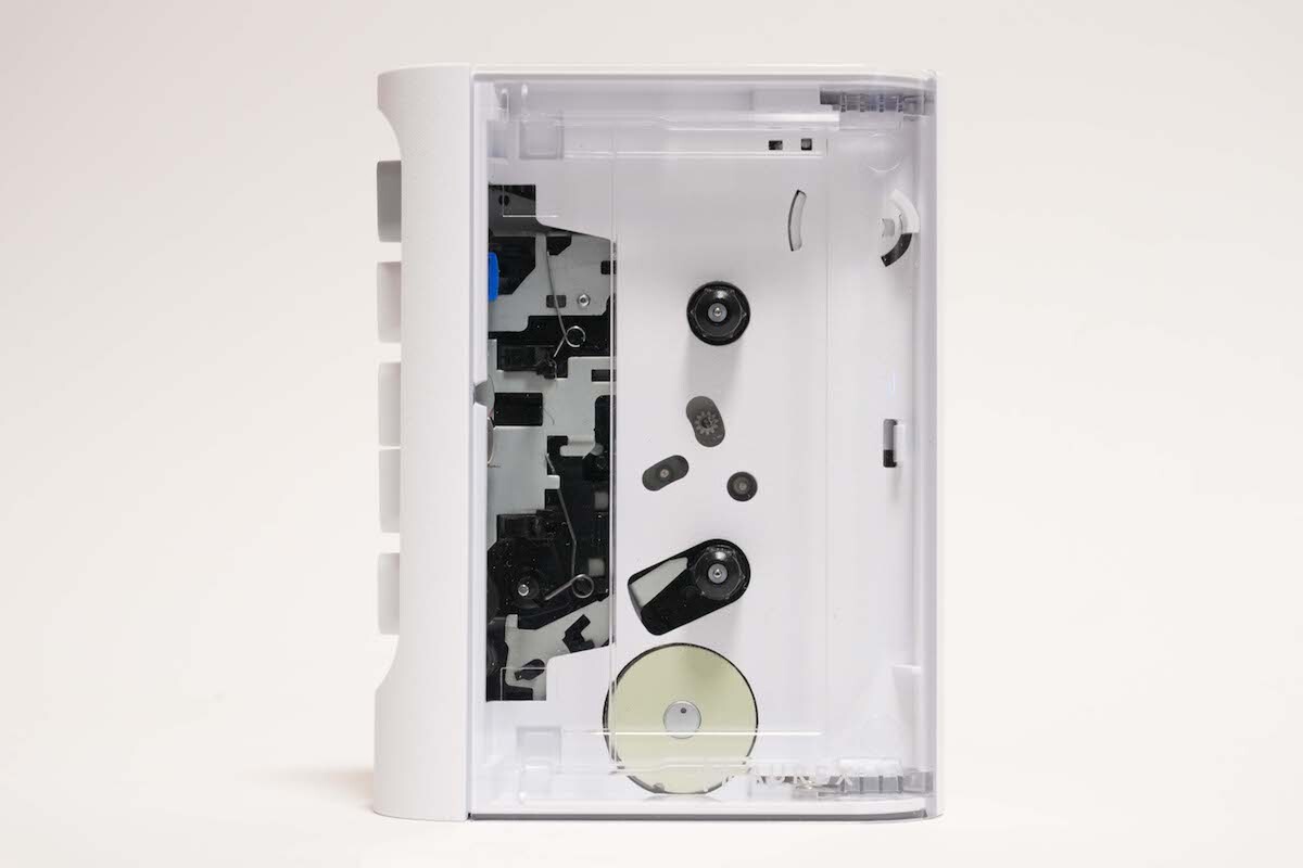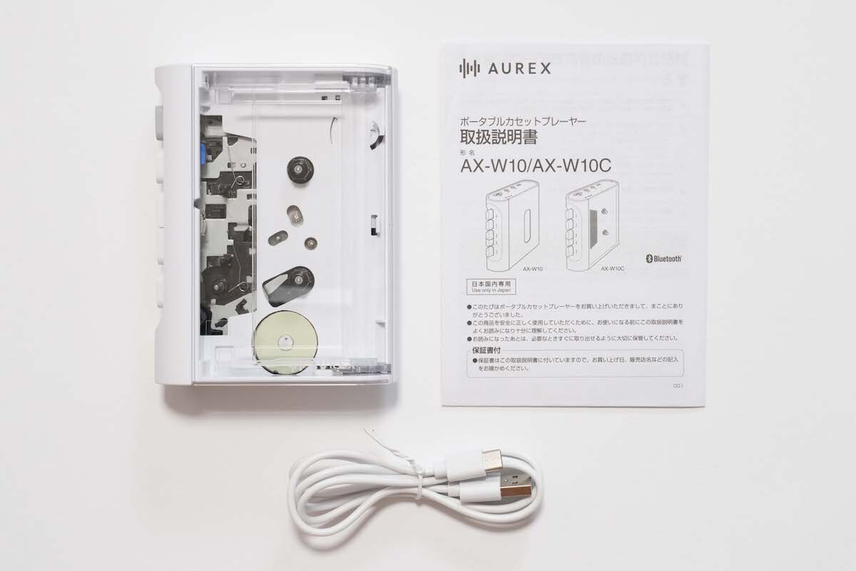 「AX-W10C」は録音、再生機能を搭載したBluetooth対応のポータブルカセットプレーヤーです。フタが透明な「AX-W10C」と、ボディーと同じくマットホワイトの「AX-W10」の2モデルが用意されています。スケルトンが大好物な私は断然「AX-W10C」が好み。でもでも、「AX-W10」にシールを貼ったり、この真っ白なボディにイラストを描いて「もらったり」するのもよいですね。