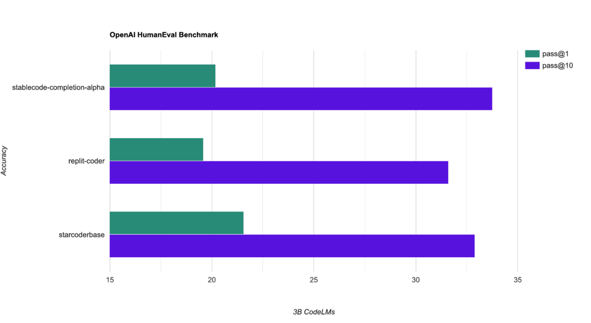 上記のグラフは同じようなパラメータ数とトークン数でトレーニングされた他のモデル(replit-coderおよびstarcoderbase)との比較。一般的なHumanEvalベンチマークで、標準的なpass@1とpass@10のメトリクスを使用している。