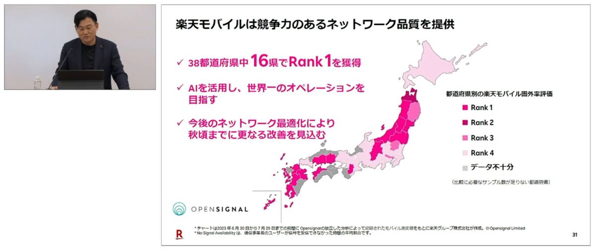 楽天モバイルは、今年6月に新プラン「Rakuten最強プラン」を開始。auローミングによってカバーされる地域も含めて、人口カバー率99%のエリアで高速データ通信無制限であることをあらためて紹介。また、Opensignalのデータでは、調査があった38都道府県中16県でMNO4社中トップの評価であったとする。