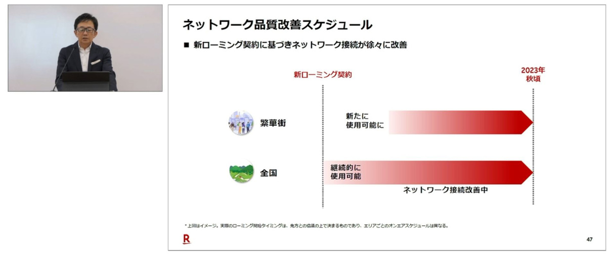 一方で、まだまだ他キャリアが強く、ユーザーが特に集中している東名阪の繁華街については、KDDIとの新ローミング契約に基づく、新たにローミングが開始される基地局の詰めが現在進められており、今秋にはサービスを開始。エリアが改善されるとした。