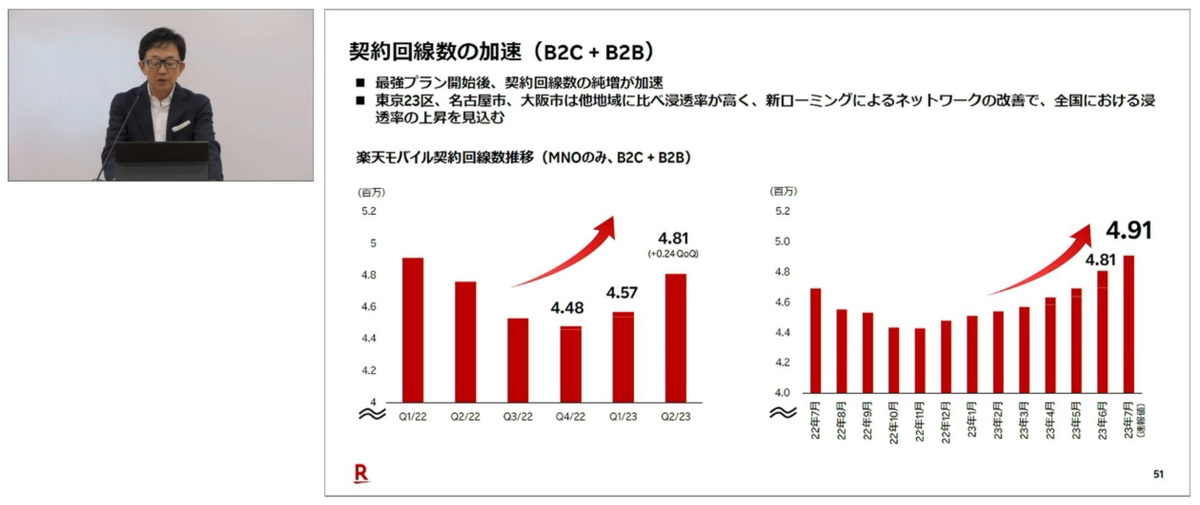 楽天グループは、2023年度第2四半期(4~6月期)の決算説明会を開催。その中でモバイル事業の見通しも語られ、契約数の伸びと設備投資の削減による損益改善についてアピールしたほか、プラチナバンドの割当を受けられた際の今年末~来年初頭での電波発射を目指すことを公表した。