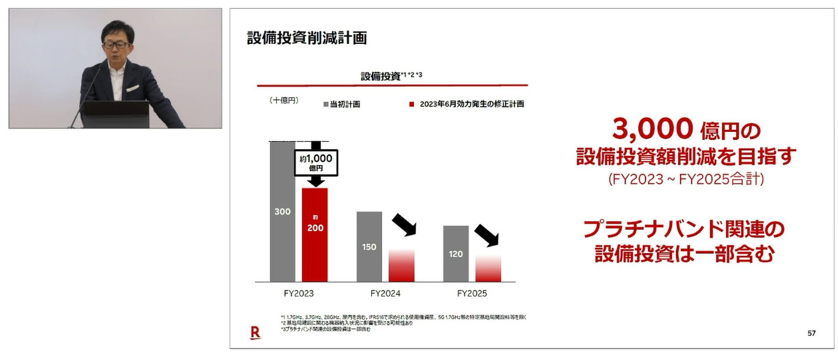 とは言え、収益改善の要因としては、やはり設備投資削減の部分が大きい。新ローミング契約もあり、2023年度だけでも当初計画の3000億円から約1000億円の削減を予定。2023~2025年の3年間の合計で3000億円の削減を目指している。