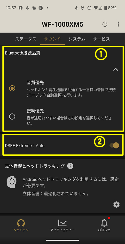 専用アプリの「サウンド」設定画面。1の「Bluetooth接続設定」を音質優先にした場合、接続しているスマホ、オーディオプレーヤーがLDACに対応しているときにBluetoothオーディオのコーデックがLDACに選択されます。2の「DSEE Extreme」はオン・オフの切り替えが可能