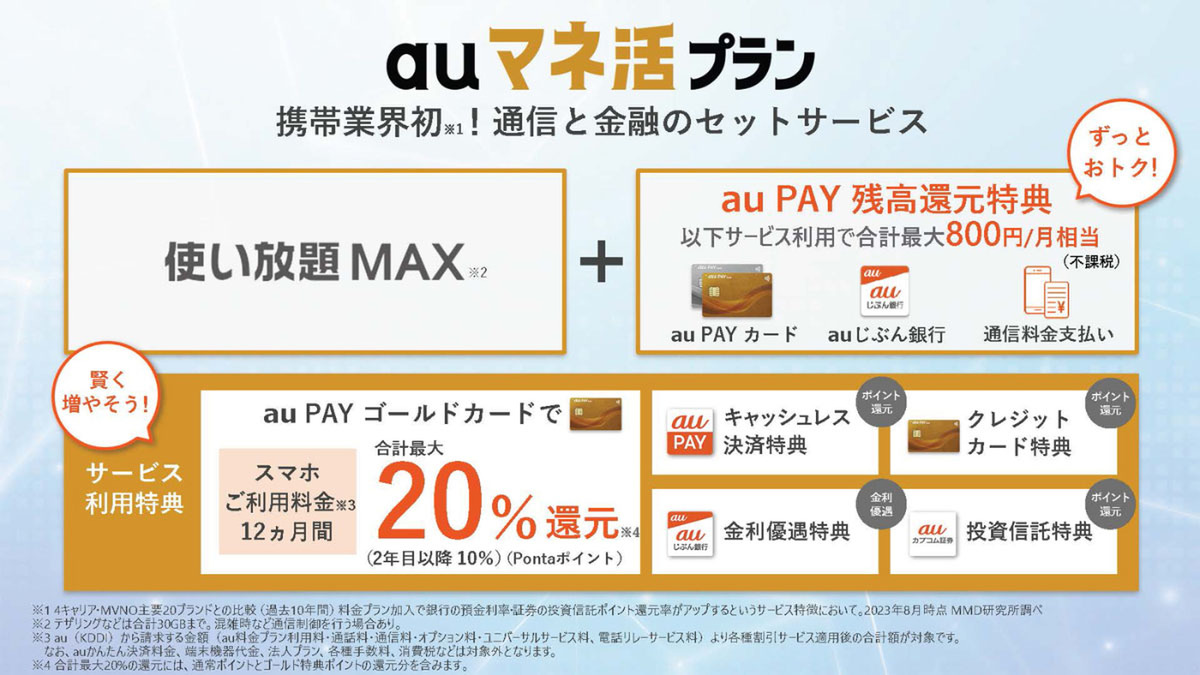 KDDIは同グループ内にある銀行や証券会社の利用を組み合わせることで、au PAY残高を還元する「auマネ活プラン」を9月1日より開始する。