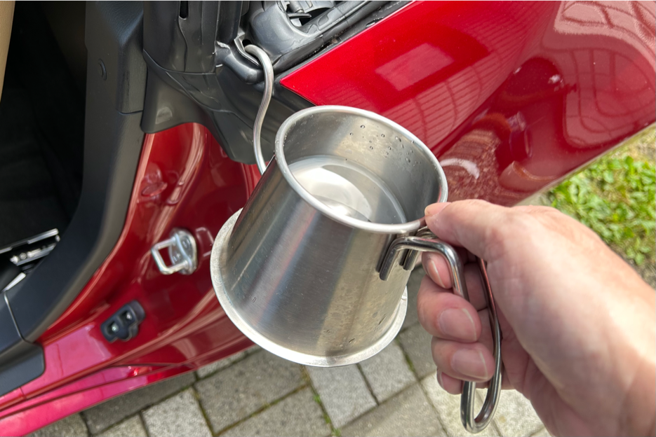 私はBピラーの穴からドリップポットで水を流し込みました。特に珈琲工具の注ぎ口は、ここに差し込むのに最適な角度で曲がっているのでオススメです。いや、まあ別に何でも良いのですが。
