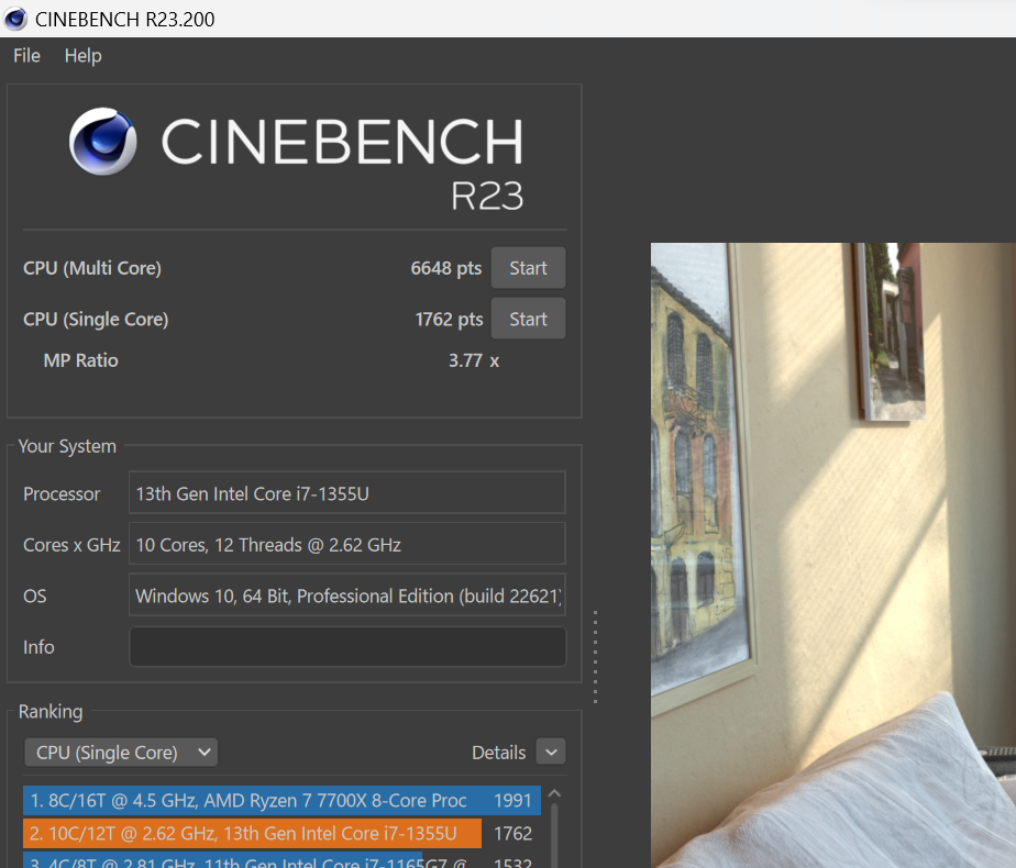 結果は、マルチコアで6648pts、シングルコアで1762ptsと、マルチコアで7000ptsに届かなかったものの、12スレッドの実力を発揮していると言える。