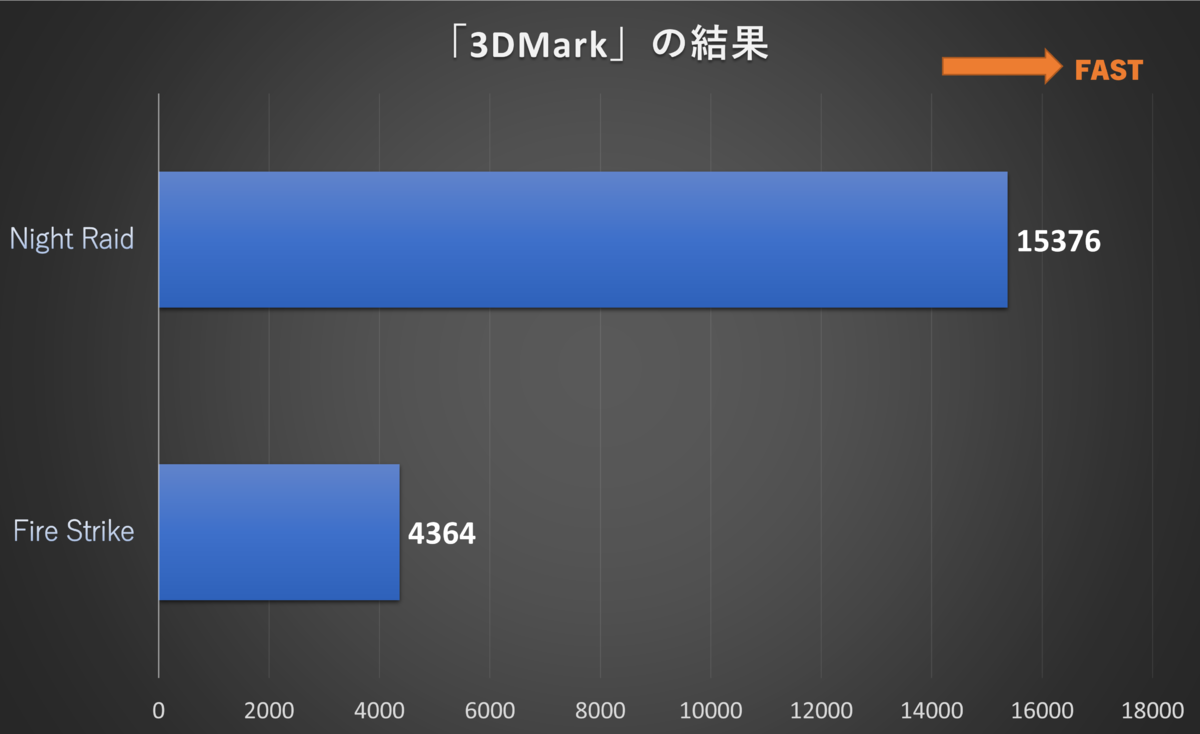 結果は、Night Raidで15376、Fire Strikeで4364と健闘している。軽めの3DCGゲームなら、設定次第で楽しめそうだ。